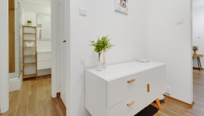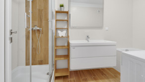 Byt (65,90m2) pozostáva zo vstupnej chodby z ktorej sa následne vchádza do všetkých miestnosti bytu. Týmito miestnosťami sú kúpeľňa s vaňou, samostatná toaleta, detská izba, obývačka spojená s kuchyňou, spálne a komory.